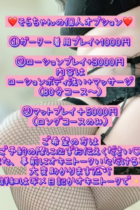 - ・ローター○ ・バイブ○ ・デンマ○ ・写メ二枚(顔なし)○ ・オナニー鑑賞○・聖水○・即尺○